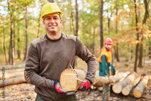 Waldarbeiter als Holzfäller in Schutzkleidung im Wald