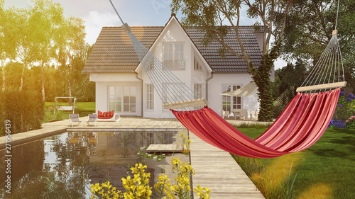 Empty red hammock on the beach by the sea in summer (3D Rendering)