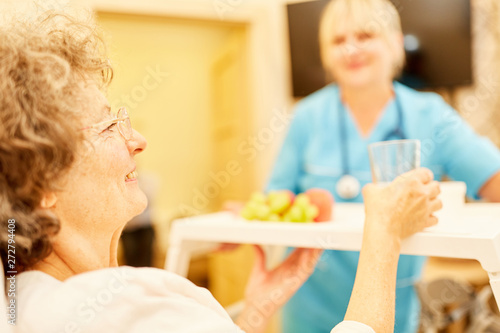 Arzt verteilt Tabletten an eine alte Frau im Gesundheitskurs im Seniorenheim