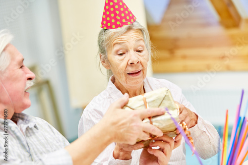 Senior as a birthday girl is happy about gift