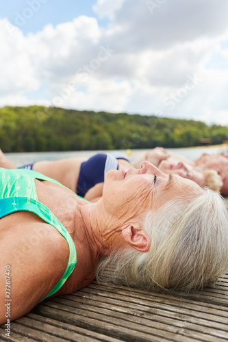 Gruppe Senioren liegt entspannt am Badesee