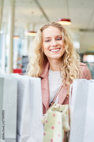 Junge Frau freut sich über ihre Einkäufe