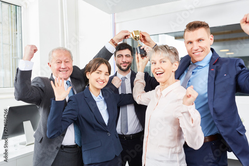 Geschäftsleute als Sieger Team mit Pokal