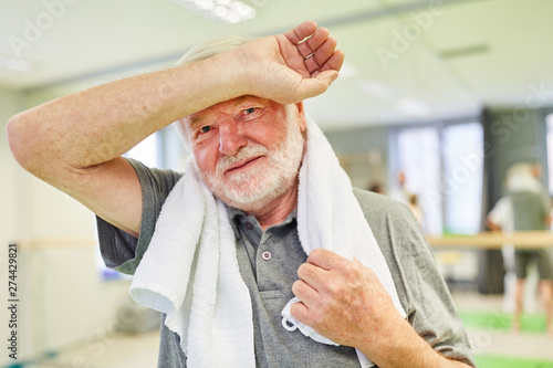 Senior Mann mit Schweiß auf der Stirn im Fitnesscenter