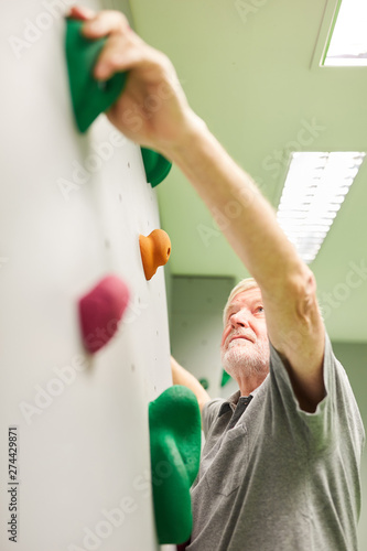 Sportlicher Senior beim Klettern in einer Kletterhalle