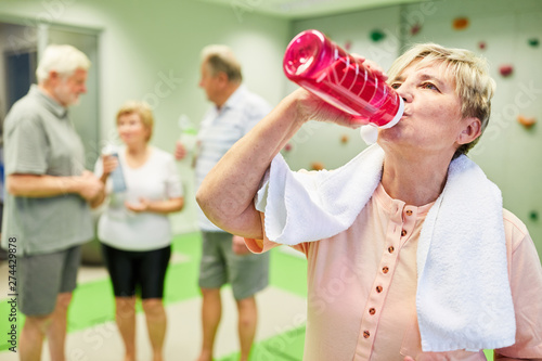 Senior Frau trinkt Wasser beim Fitness Training
