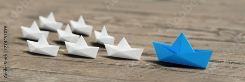 Blue paper boat leading a fleet of white origami boats