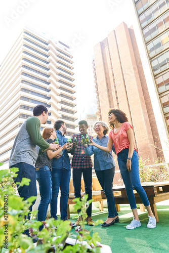Gruppe Freunde beim Anstoßen mit Flasche Bier