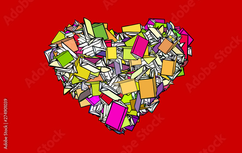 Viele Bücher als Herz vor roten Hintergrund