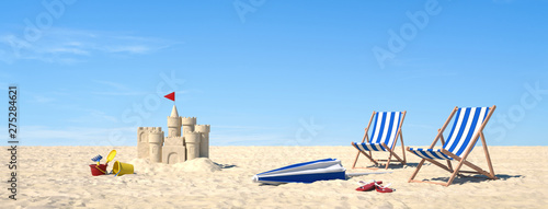 Sandcastle and loungers on the beach with palm tree