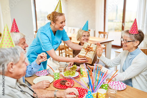Senioren trinken Kaffee auf Geburtstagsfeier
