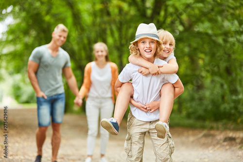 Familie zeigt bunte Zeichnung mit Eigenheim