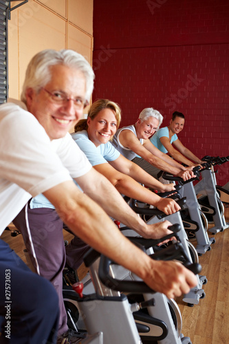 Trainerin mit Stoppuhr zwischen Senioren beim Spinning