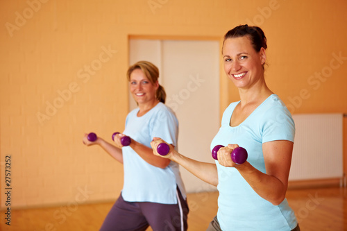 Zufriedene Gruppe mit Hanteln im Fitnesscenter