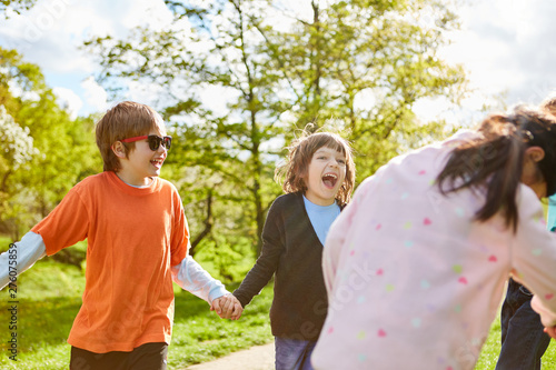 Gruppe Kinder spielt ausgelassen mit einem Ball