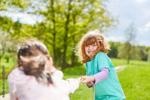 Zwei Mädchen beim Tauziehen im Sonnenschein