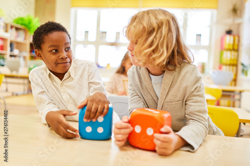 Mädchen in Schule steht vor Tafel mit Muskeln