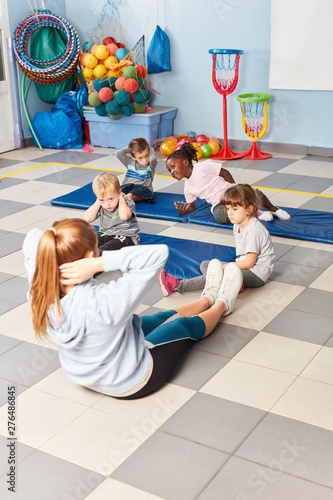 Lehrerin und Kinder dehnen im Gymnastik Kurs