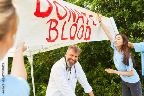Team Freiwilliger macht Werbung für Blutspende