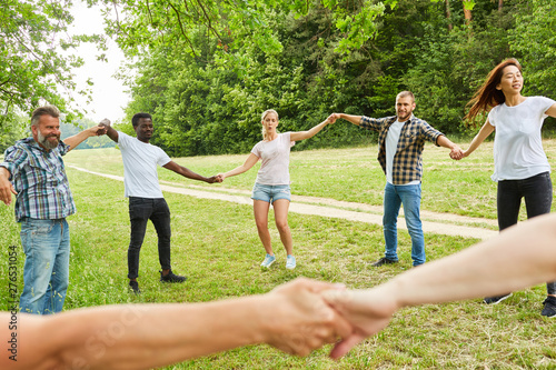 Junge Leute stehen im Kreis im Teambuilding Workshop