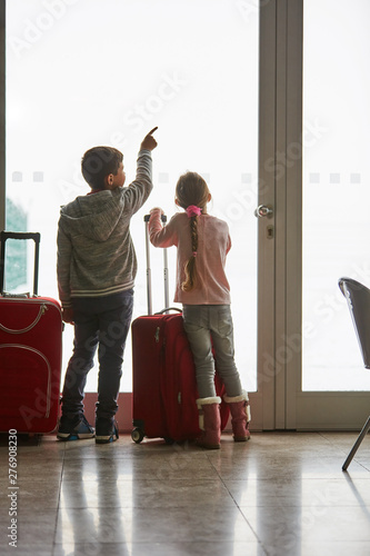 Mutter und Tochter am Fenster im Flughafen Terminal