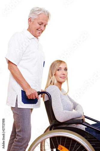 Krankenpflegerin tröstet Frau im Rollstuhl