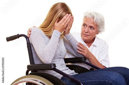 Krankenpflegerin tröstet Frau im Rollstuhl
