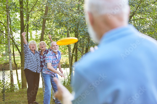 Senioren haben Spaß beim Frisbee Spiel