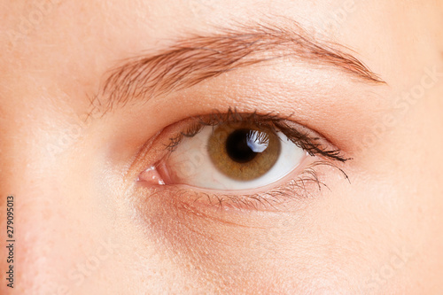 Close-up portrait of a woman showcasing her green eye with freckles and perfect eyelashes