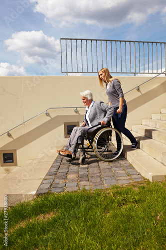 Rollstuhlfahrerin mit Begleitung auf Treppen