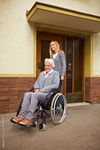 Senioren im Rollstuhl und mit Gehhilfe mit Pflegekraft
