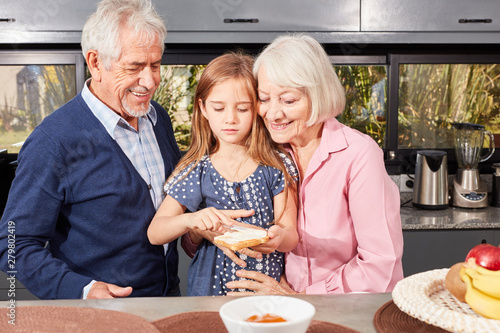 Großeltern helfen Enkeltochter beim Brot schmieren