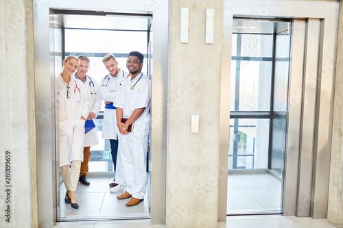 Gruppe Ärzte im Fahrstuhl im Krankenhaus