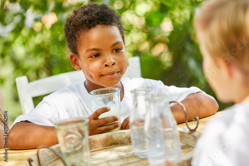 African boy is drinking a glass of milk