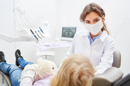 Zahnarzt erklärt Kind und Mutter Behandlung