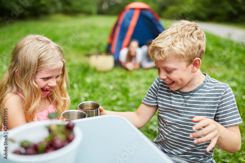 Kinder mit Tassen auf dem Campingplatz