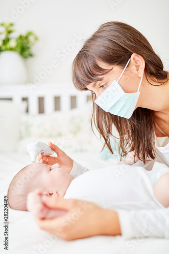 Mutter und Baby beim Fieber messen mit Thermometer
