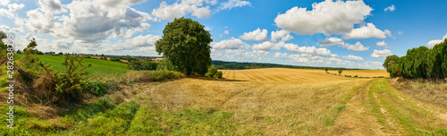 Panoramic view of a rural landscape with cloudy skies and open fields