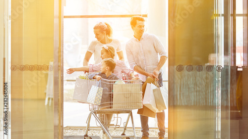 Familie schiebt Kinder im Einkaufswagen beim Shopping