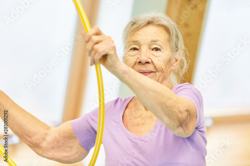 Senior Frau macht Übung mit dem Reifen