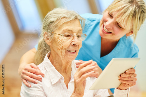 Pflegekraft hilft Seniorin mit Tablet Computer