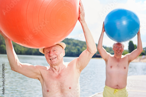 Two seniors are doing gymnastics with a gym ball