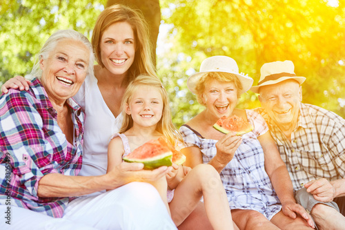 Extended family eating melon in summer