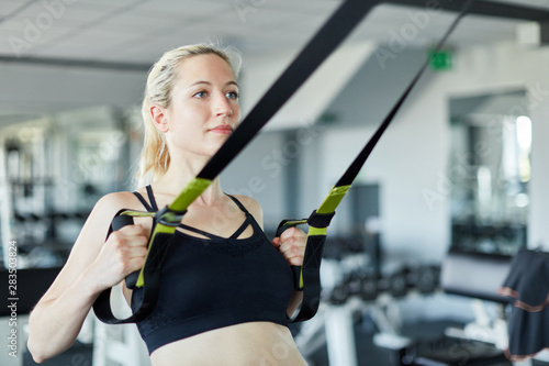Frau gibt Bewertung am Smartphone im Fitnesscenter