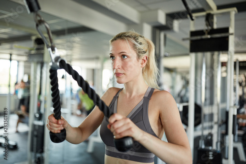 Junge Frau trainiert Trizeps Muskel mit dem Seil