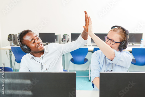Gruppe Studenten jubelt nach bestandener Prüfung