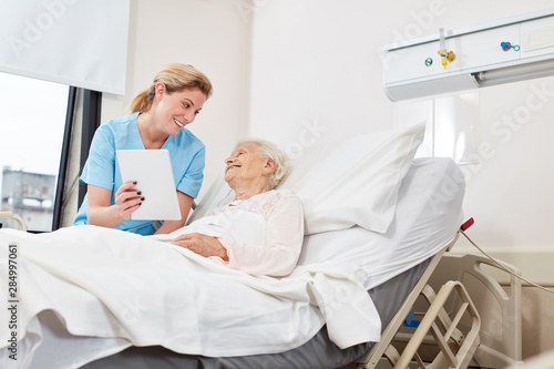 Pflegekraft mit Tablet und eine Gruppe Senioren