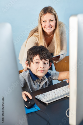 Schüler bei Nachhilfe mit Lehrer und Laptop