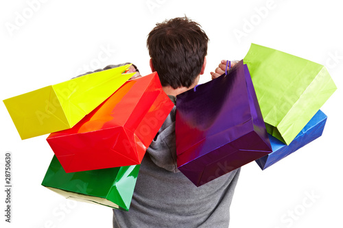 Mann mit vielen Einkaufstaschen von hinten
