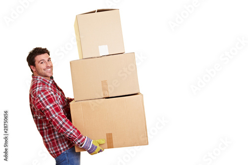 Lachender Umzugshelfer mit Kartons